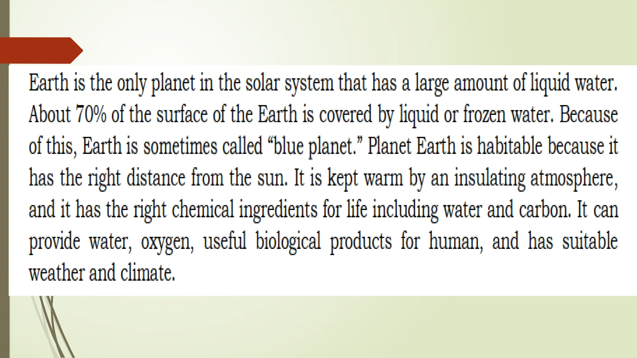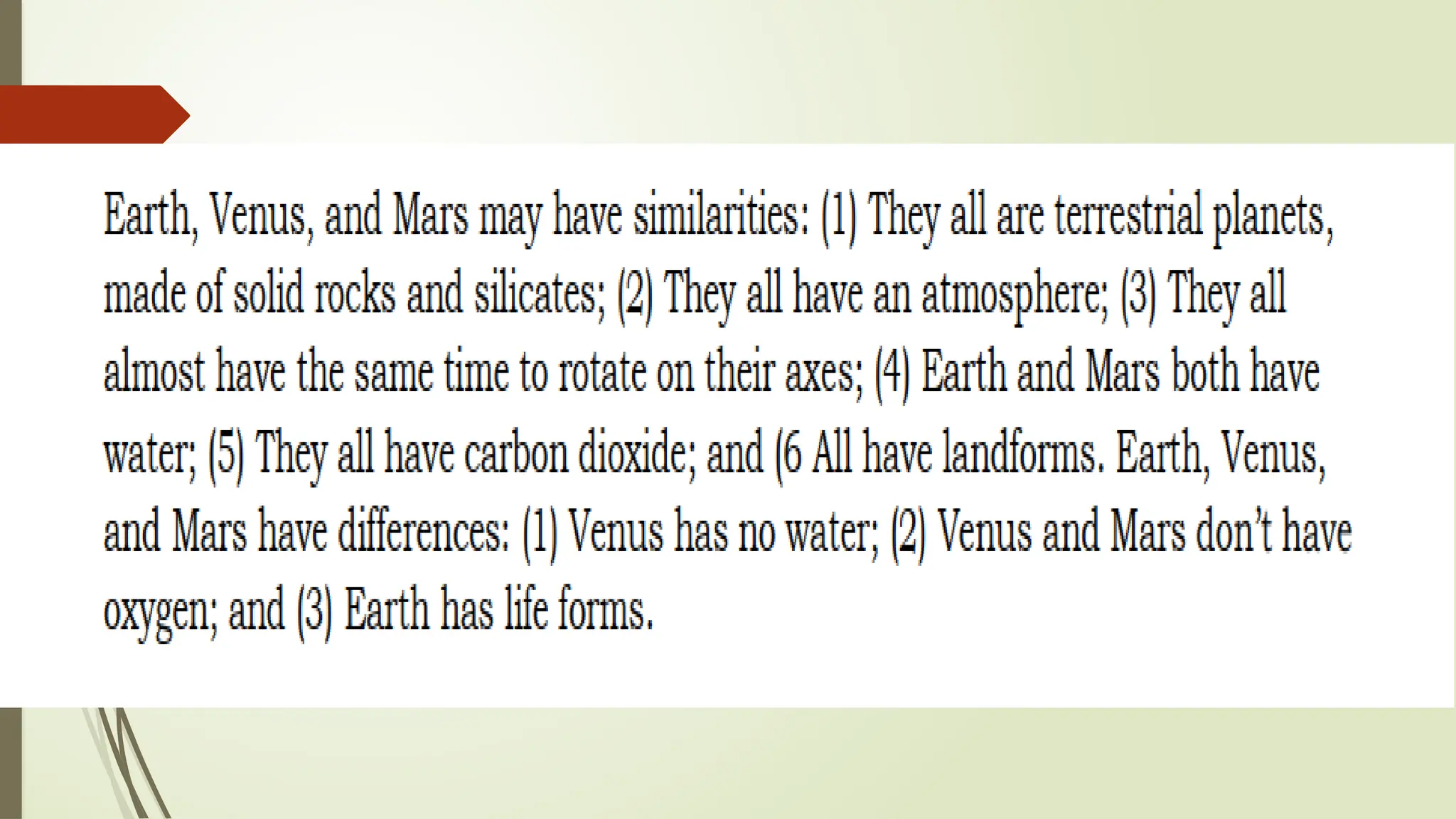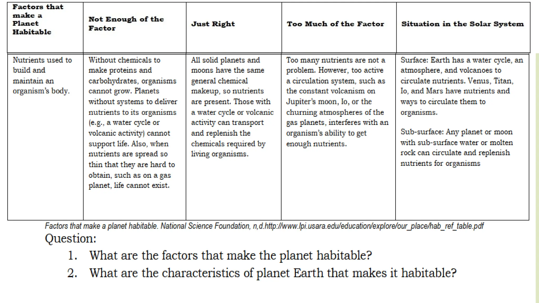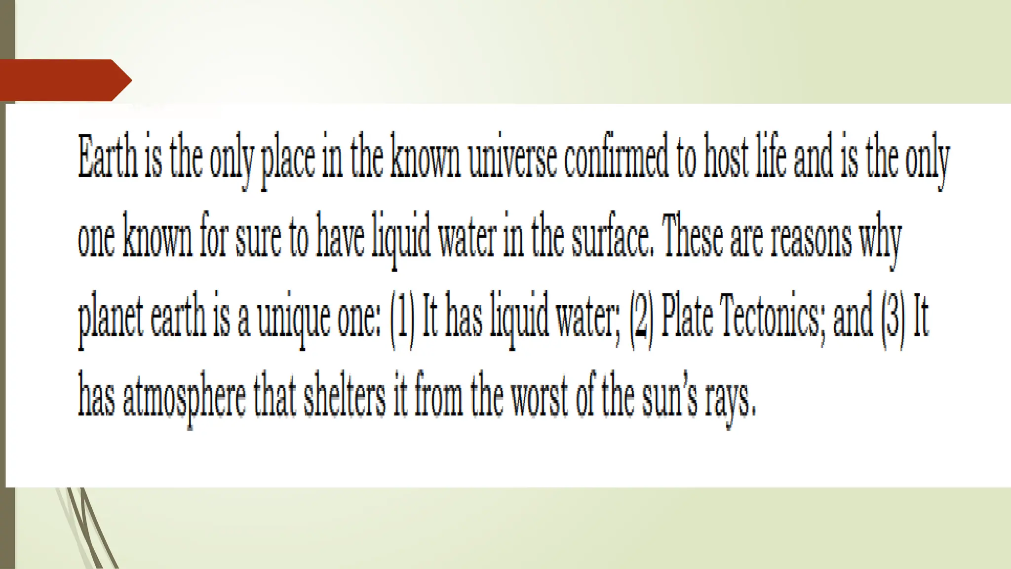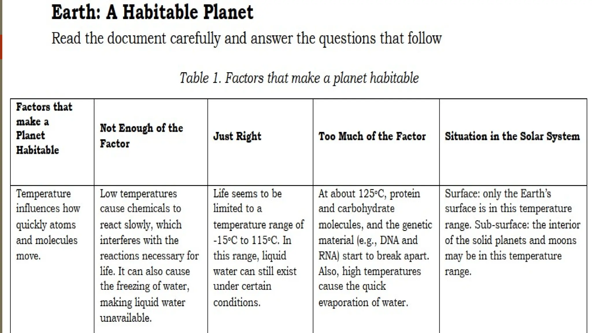 The document outlines the characteristics that make Earth habitable, such as its distance from the sun, magnetic field, atmosphere, and availability of water and carbon. It compares Earth with Venus and Mars, noting similarities like being terrestrial planets and differences such as the presence of liquid water on Earth's surface. Additionally, it highlights that Earth is unique for sustaining life, in contrast to its neighboring planets.
