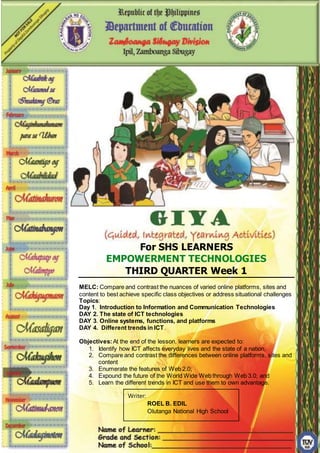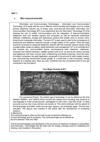 This document provides an overview of a lesson on information and communication technologies (ICT). It discusses four major periods in the history of ICT: pre-mechanical, mechanical, electro-mechanical, and electronic. Key technologies from each period are identified. The document then covers modern ICT topics like the internet, World Wide Web, social media, mobile technologies, and online platforms. Example applications and systems are provided for different ICT categories like search engines, communication services, and payment systems. Learners will compare and contrast online platforms and identify future trends in ICT.