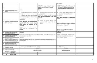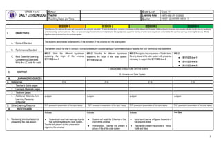 This document contains the daily lesson log for an Earth and Life Science class in Grade 11. The objectives for the week are to understand the formation of the universe and solar system. On day one, students will discuss hypotheses for the origin of the universe and solar system. They will watch a video on the universe and its expansion. On day two, students will analyze theories on the origin of the solar system and discuss its composition. On day three, students will evaluate whether planets and moons can support life based on criteria. Formative assessments will be used to check understanding throughout the week.