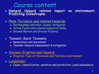 This document provides an overview of the course content for a class on geological hazards. The course will cover various natural hazards including earthquakes, tsunamis, volcanoes, landslides, storms, wildfires, and floods. It will examine the causes and impacts of these hazards as well as mitigation strategies. Case studies of specific geological hazard events will also be discussed. The course aims to provide an understanding of natural processes and how to assess and reduce risks from natural hazards.