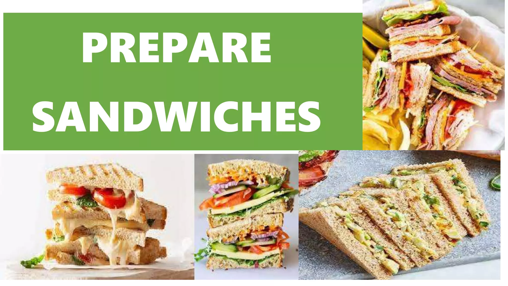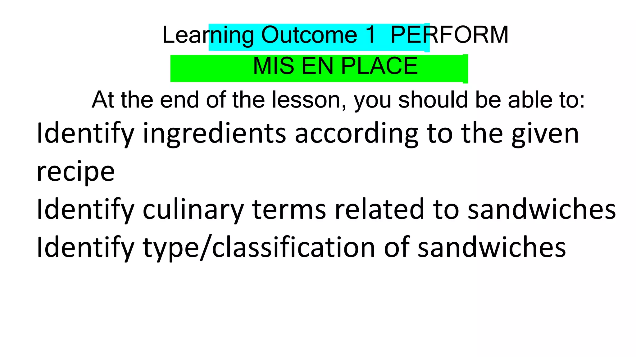 The document provides information on tools, utensils, and equipment used for making sandwiches. It lists various knives, boards, bowls, and other items needed for preparing ingredients and assembling sandwiches. It also describes different types of cooking appliances that can be used in sandwich making, such as grills, ovens, toasters, and chillers. The overall document serves as a reference for the key tools and equipment involved in the sandwich preparation process.