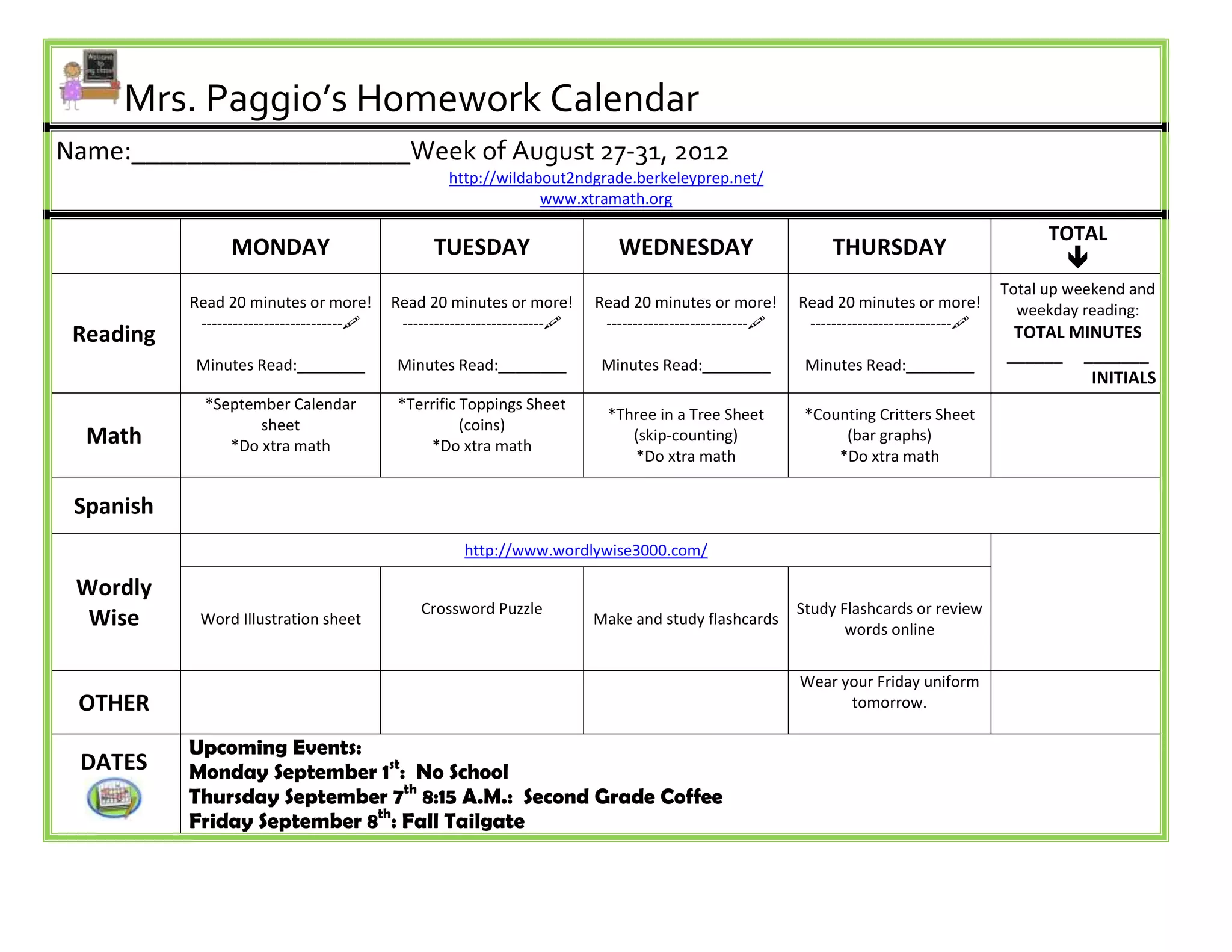 Mrs. Paggio's Homework Calendar provides assignments for a student for the week of August 27-31, 2012. It includes reading assignments of 20 minutes per day along with tracking total minutes read for the week. Math assignments include the website xtramath.org daily. Other subjects assigned are Spanish, Wordly Wise vocabulary words either online or with flashcards, and wearing the Friday uniform on Thursday. Upcoming school events are also noted.