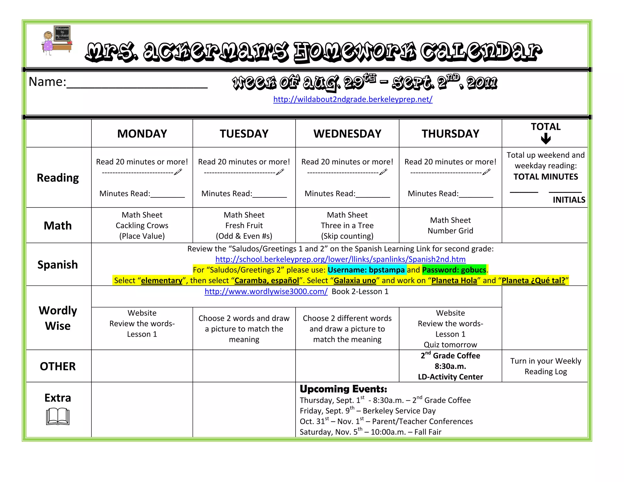 The document is Mrs. Ackerman's homework calendar for the week of August 29th through September 2nd for a second grade student. It outlines the daily homework assignments and activities for each subject, including 20 minutes of reading per day, math sheets, Spanish lessons, Wordly Wise online activities, and word study options. It also lists upcoming school events for the month.