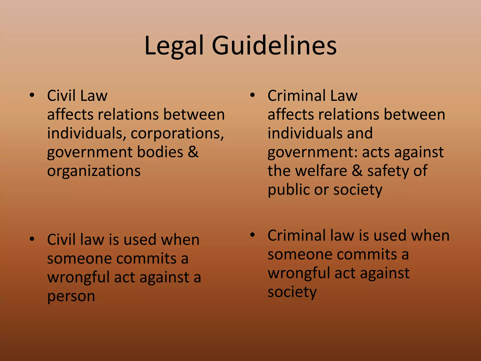 Civil law governs relations between individuals and organizations, and is used when a wrongful act is committed against another person. Criminal law governs relations between individuals and the government, and is used when a wrongful act harms society. The Controlled Substances Act classifies drugs into five schedules based on their potential for abuse and addiction, from Schedule I which has no accepted medical use to Schedule V which has a limited addiction potential. Prescriptions must be issued and signed only by the registered health professional. A subpoena is a court order that can demand a person or medical records, while an expert witness testifies in court about the standard of care in a particular medical field.