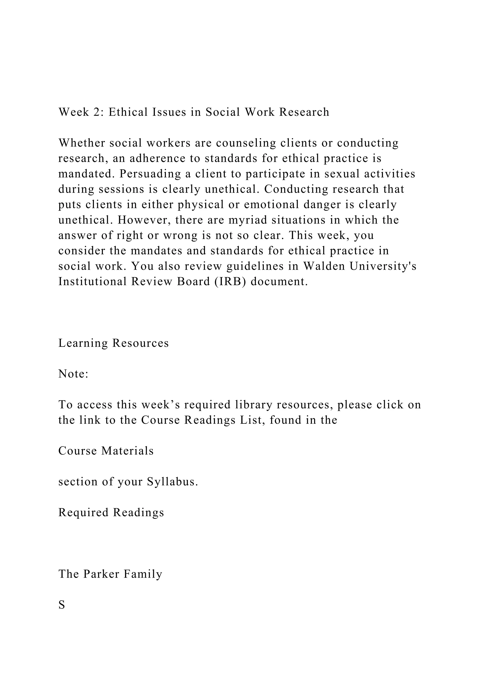 The document discusses ethical issues in social work research, emphasizing the importance of adhering to ethical standards to protect clients from potential harm. It highlights the case of the Parker family, focusing on the challenges posed by Sara's hoarding and mental health issues, as well as the conflict with her daughter Stephanie, who has bipolar disorder. The social worker's role includes assessing the family's needs and coordinating support services while navigating the complexities of their situation and ethical considerations regarding their care.