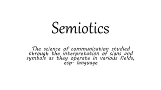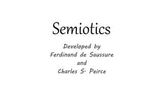 This document provides an overview of semiotics, the study of signs and symbols. It discusses the founders and key concepts of the field. Specifically, it notes that semiotics is the study of communication through interpretation of signs and symbols. It then discusses the founders Ferdinand de Saussure and Charles Sanders Peirce. Peirce distinguished between icons, indexes, and symbols. Icons resemble what they represent, indexes have a causal relationship but no resemblance, and symbols have no resemblance but are determined by rules governing their meaning. The document also mentions that for Saussure, there is no actual relationship between the signifier and signified.