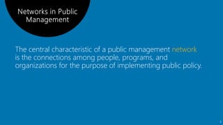 This document discusses different types of public management networks. Public management networks connect people, programs, and organizations across governmental and non-governmental sectors to implement public policy. They involve the exchange of information, resources, and potential solutions between multiple stakeholders. While action is discussed and solutions developed at the network level, implementation occurs within the individual member organizations and agencies.