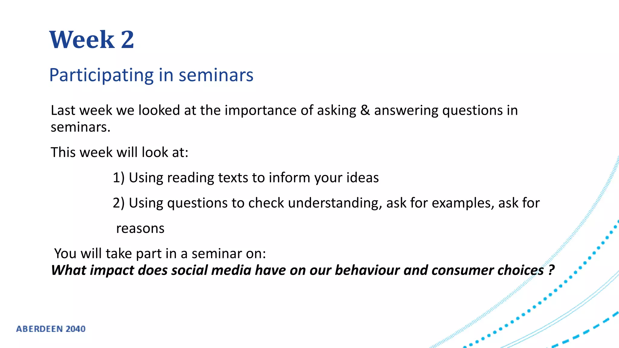 This document provides guidance and materials for a seminar on how social media impacts behavior and consumer choices. It discusses the importance of using readings to inform ideas and asking questions to check understanding or ask for reasons. Students are instructed to complete tasks analyzing three models of media effects and influence. These model explanations will help students understand the debate around passive versus active audiences and the degree of influence from media. Students are asked to find examples from their research to contribute to the seminar discussion on the impact of social media.
