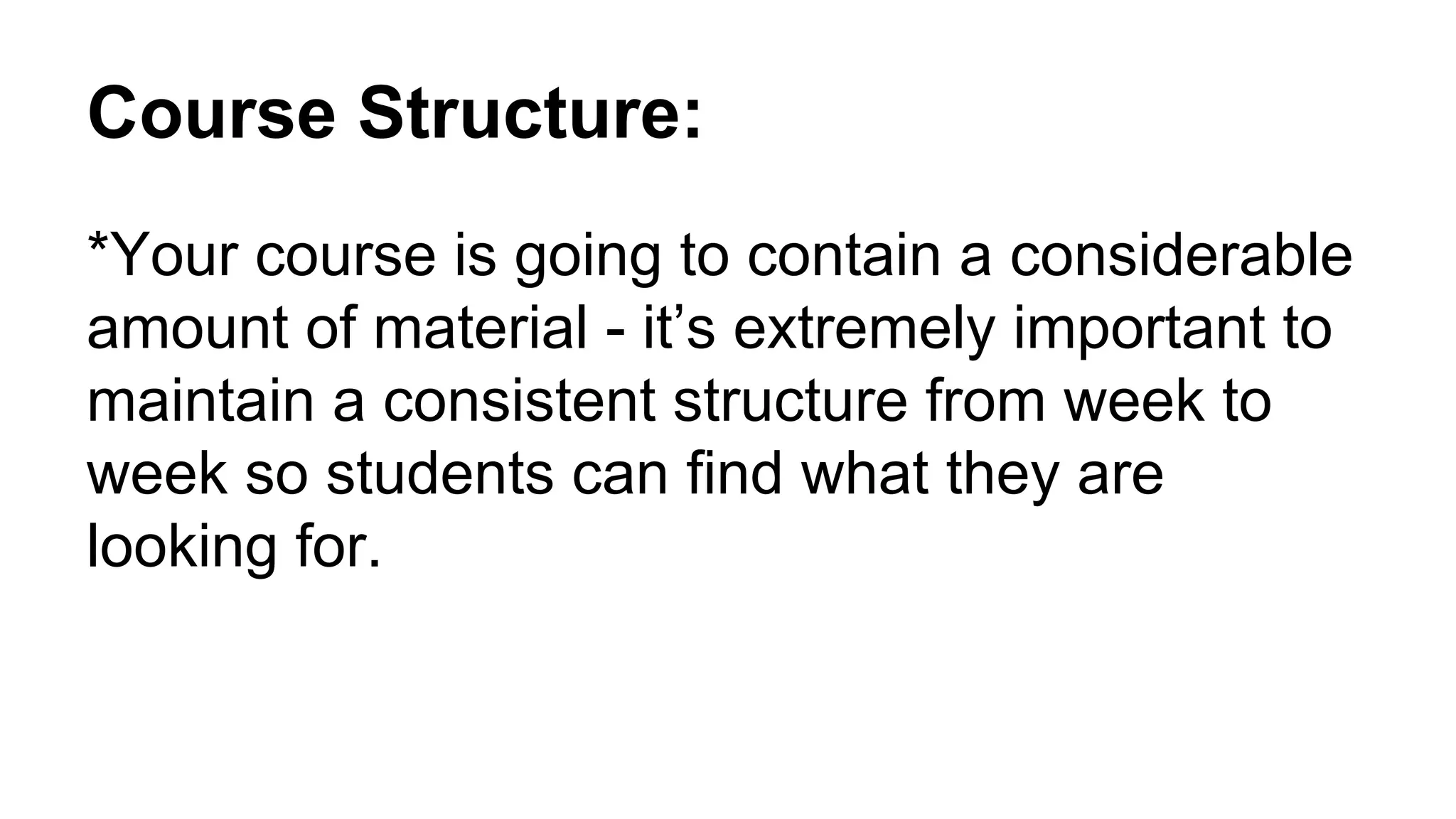 1. Maintaining consistent structure from week to week so students can easily navigate. This includes using the same assignment types, due dates, and communication methods.