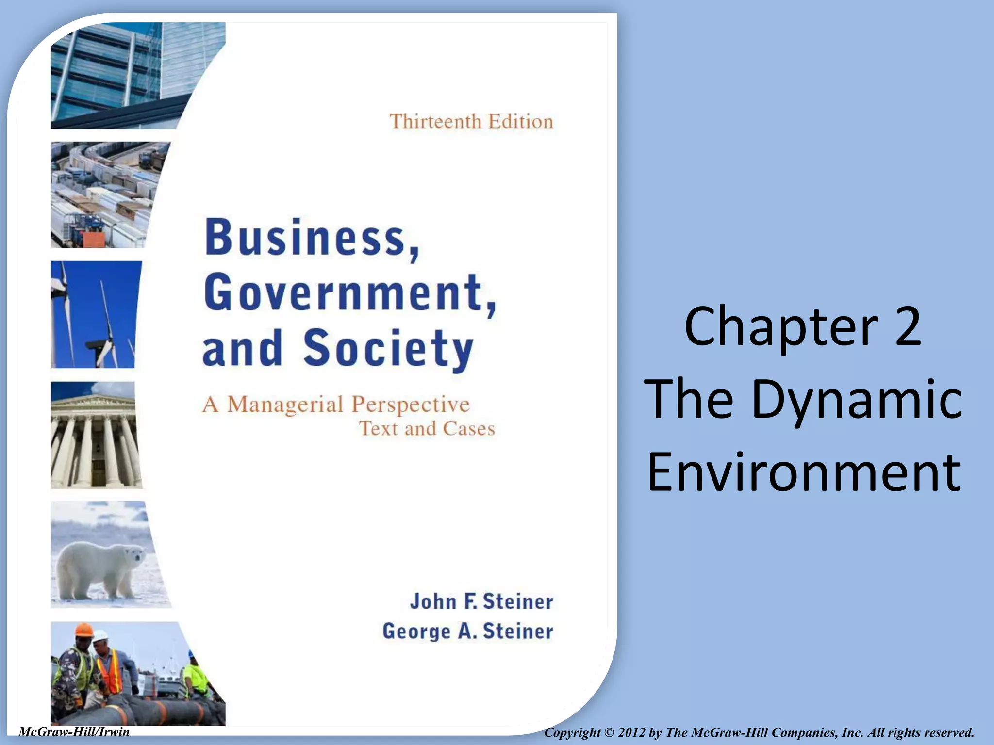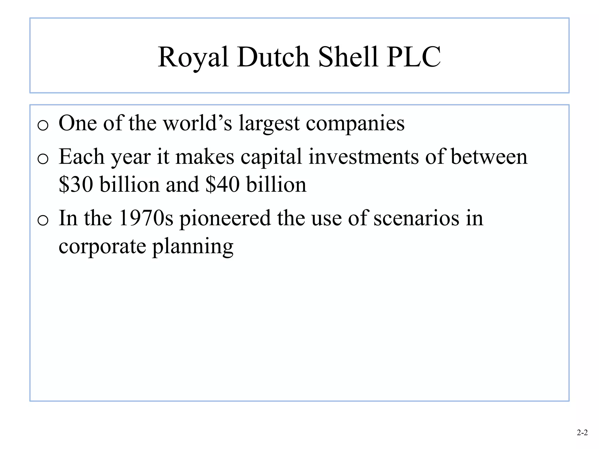 This document provides an overview of Royal Dutch Shell and discusses nine deep historical forces that have shaped the dynamic business environment: the Industrial Revolution, inequality, population growth, technology, globalization, nation-states, dominant ideologies, great leadership, and chance. It also examines key external environments including the economic, technological, and cultural environments that influence business operations.