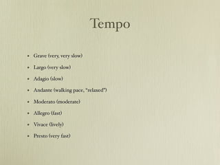 This document discusses musical expression through tempo and dynamics. It lists Italian terms that indicate different tempos from very slow to very fast. It also discusses modifiers that can change the base tempo indication. Additionally, it outlines dynamics from very soft to very loud and symbols that indicate crescendos, decrescendos, and accented notes.