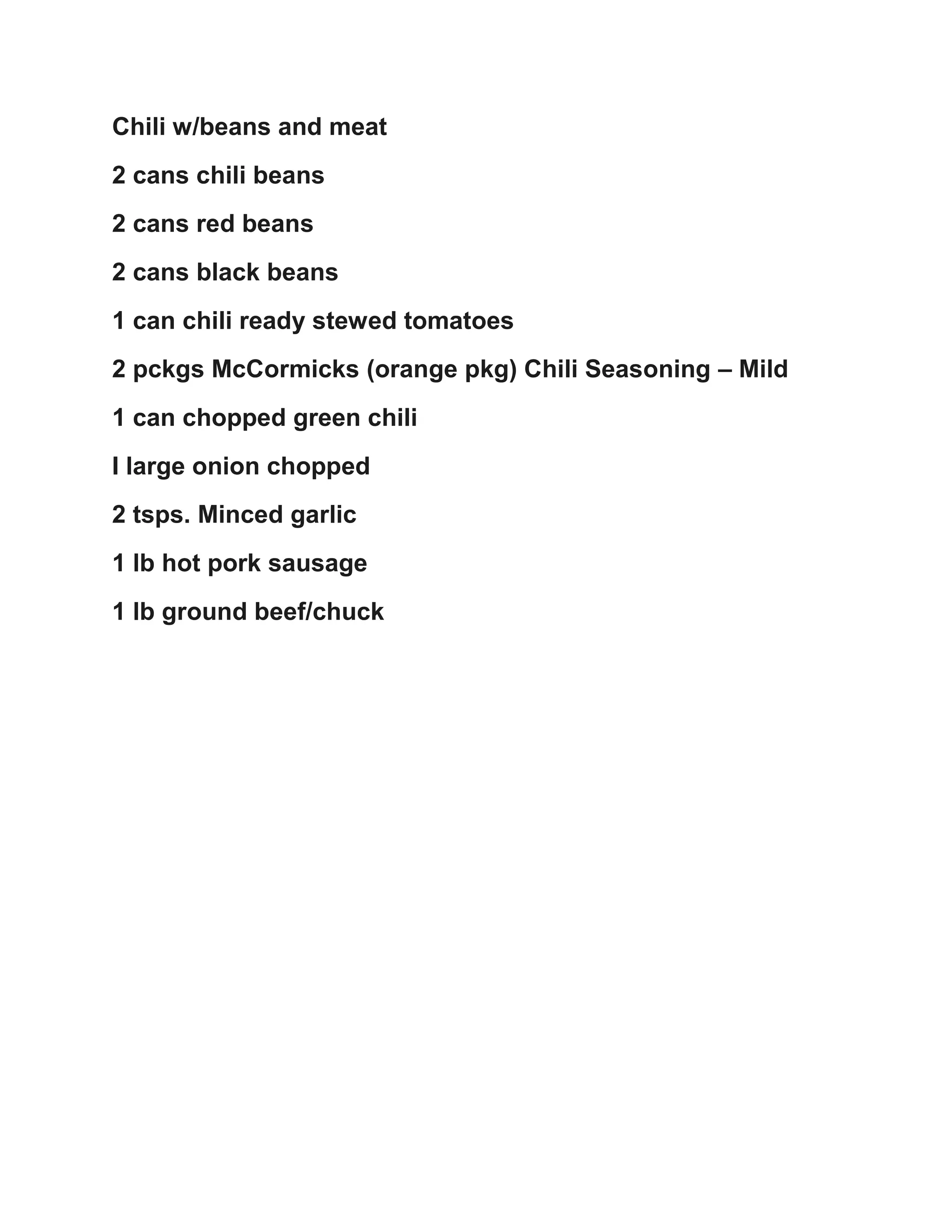 This recipe combines several cans of beans with chili seasoning, tomatoes, onions, garlic and ground beef and sausage to make a hearty chili with beans and meat. It uses two cans each of chili beans, red beans and black beans along with one can of chili stewed tomatoes and chopped green chilies. The meat includes one pound each of hot pork sausage and ground beef or chuck.