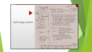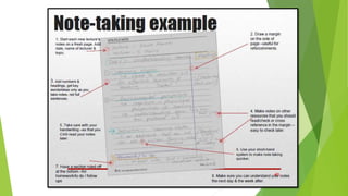 This document provides strategies for effective reading, note-taking, and becoming a critical reader at the university level. It recommends skimming texts first to get an overview before reading selectively. When taking notes, use bullet points and abbreviations rather than full sentences. Be a critical reader by questioning claims and looking for biases or disagreeing viewpoints. Read introductions and conclusions first to understand the main argument and thesis. Take notes on topic sentences to grasp each paragraph's essential point.