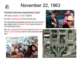 The assassination of President John F. Kennedy occurred on November 22, 1963, in Dallas, Texas, while he was on a campaign trip. Lee Harvey Oswald was identified as the assassin, but theories and debates about the circumstances of the assassination and potential conspiracies continue to this day. The Warren Commission concluded that Oswald acted alone, though subsequent investigations suggested the possibility of at least one other gunman.