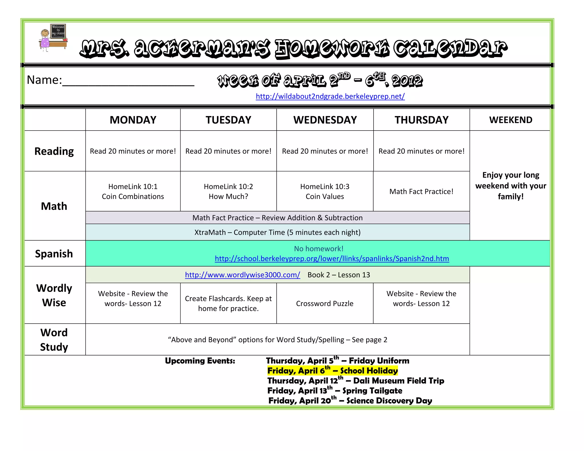 This document is Mrs. Ackerman's homework calendar for her second grade class for the week of April 2nd-6th, 2012. It outlines the following homework assignments for each day: reading for 20 minutes or more each night along with specific homework links or worksheets for math, Spanish, and wordly wise. It also provides optional "above and beyond" word study activities like writing words in rice or tracing dotted letters. Upcoming school events are noted at the bottom.