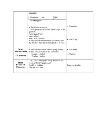 - Details of the lesson which includes warming up, reviewing the previous lesson, presenting new material, and a group reinforcement activity. Students are assigned homework from their workbook.