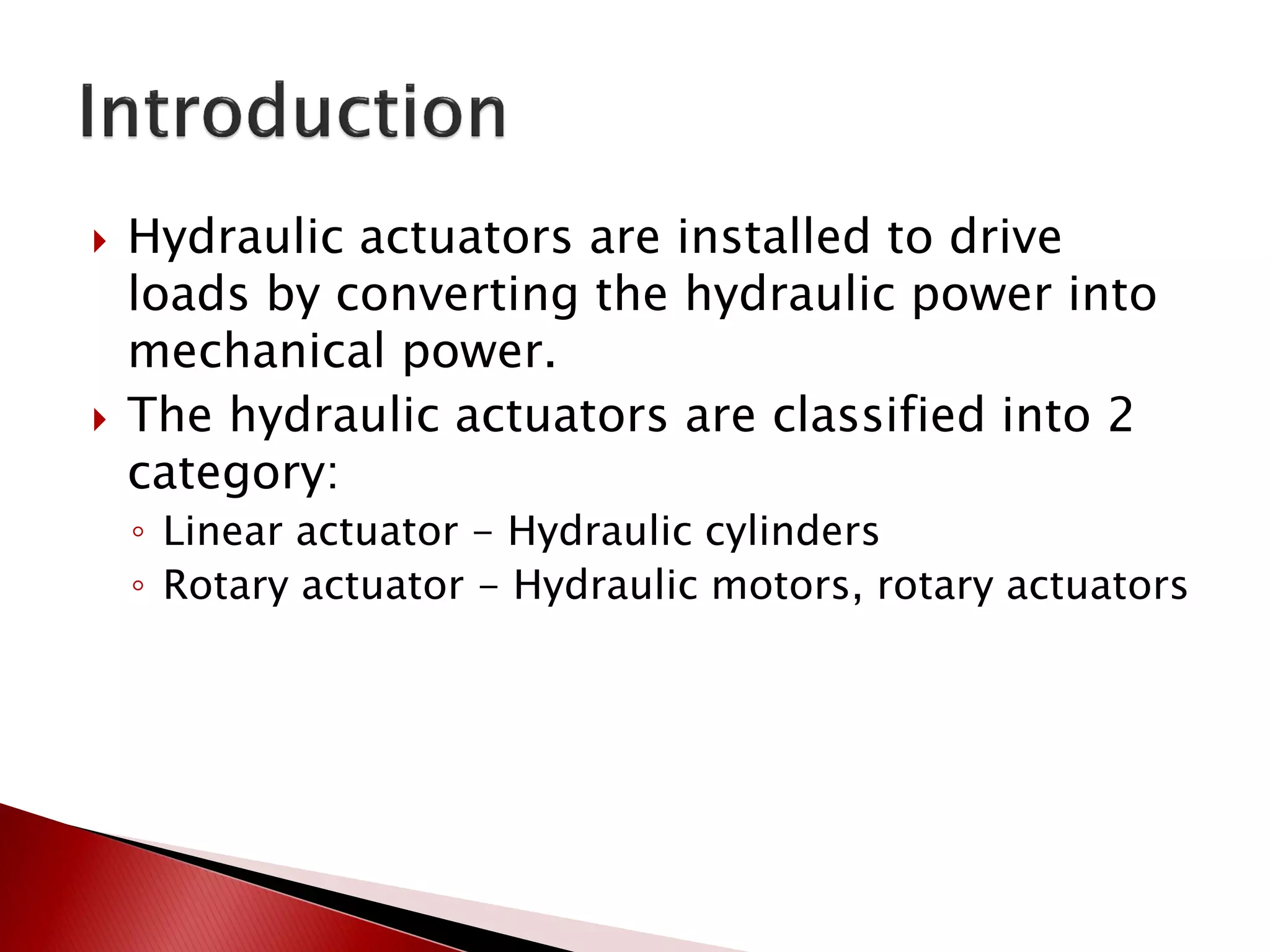 Hydraulic actuators convert hydraulic energy to mechanical motion or force. There are two main types: linear actuators like hydraulic cylinders, and rotary actuators like hydraulic motors. Hydraulic cylinders are further classified as single acting or double acting. Single acting cylinders use pressure on one side of the piston and a spring or external force for return, while double acting cylinders use pressure on both sides to push and pull the piston. Key parameters that determine cylinder selection and sizing include bore diameter, rod diameter, stroke length, working pressure, area ratio, and mechanical efficiency.