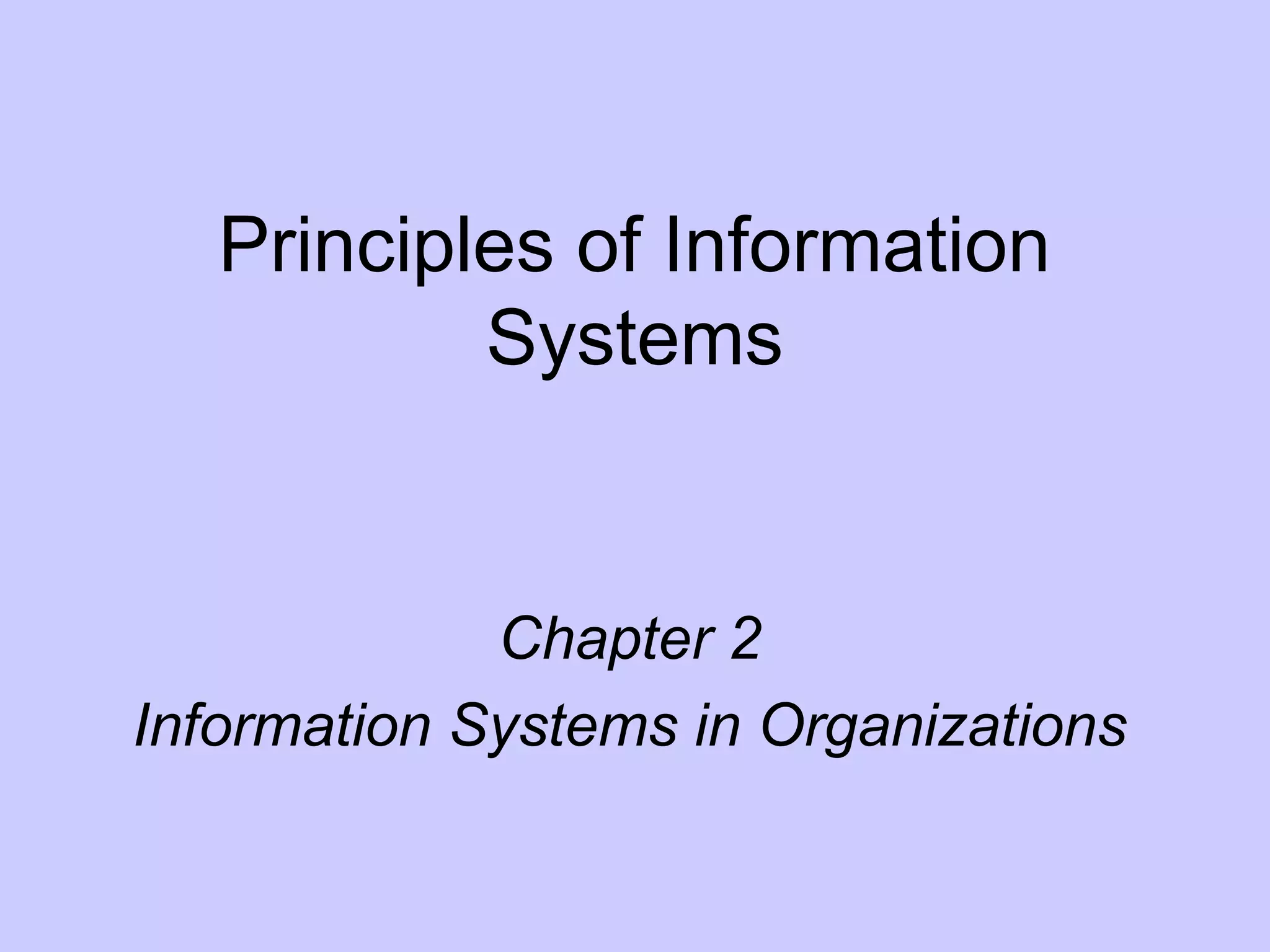 This document discusses principles of information systems in organizations. It covers topics like organizational structure, culture, and change; competitive advantage; quality initiatives; careers in information systems. Specifically, it defines key terms like organizational structure, culture, and change. It also discusses how information systems can help lower costs, increase profits and gain competitive advantages. Finally, it identifies various roles and functions within information systems departments like operations, systems development and support.