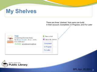 The document discusses the different "shelves" and lists users can create in their library account, including a Completed shelf for annotated items, an In Progress shelf for items currently being read, and a For Later shelf for items to borrow later. It also describes how users can create their own public or private lists and add items to those lists from item details pages or a search. Finally, it covers how users can manage which other users they follow or ignore annotations from using the Follow/Ignore feature.