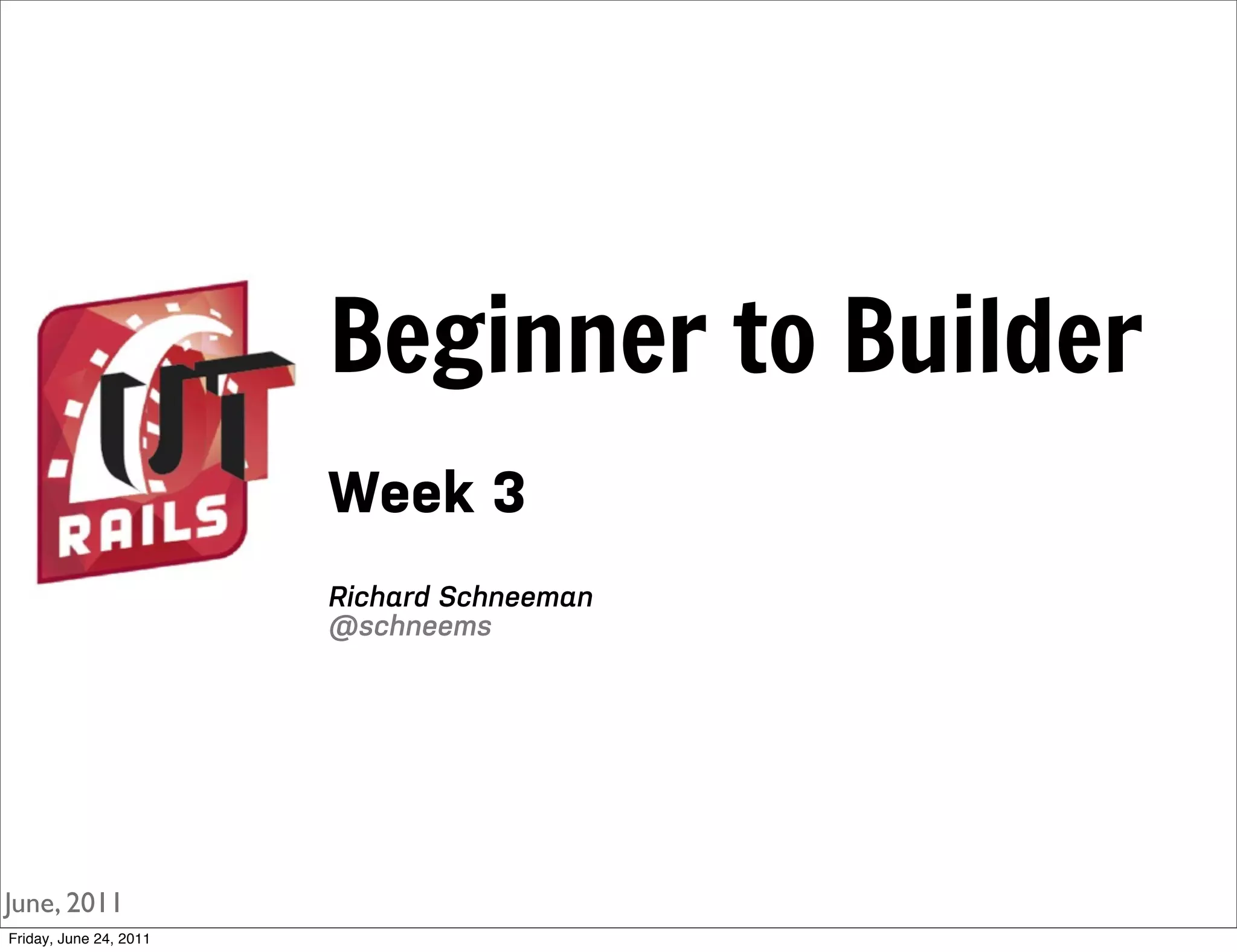 This document contains notes from a Rails training session. It discusses variables in Ruby and Rails, controllers, testing controllers, associations between database tables, and many-to-many relationships. Key topics covered include using instance variables to share data between models and views, testing controller actions, the params hash, and setting up belongs_to, has_many, has_many :through, and HABTM associations.