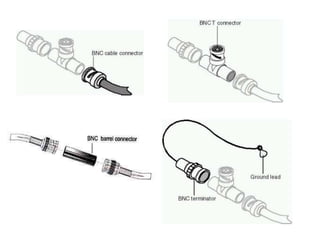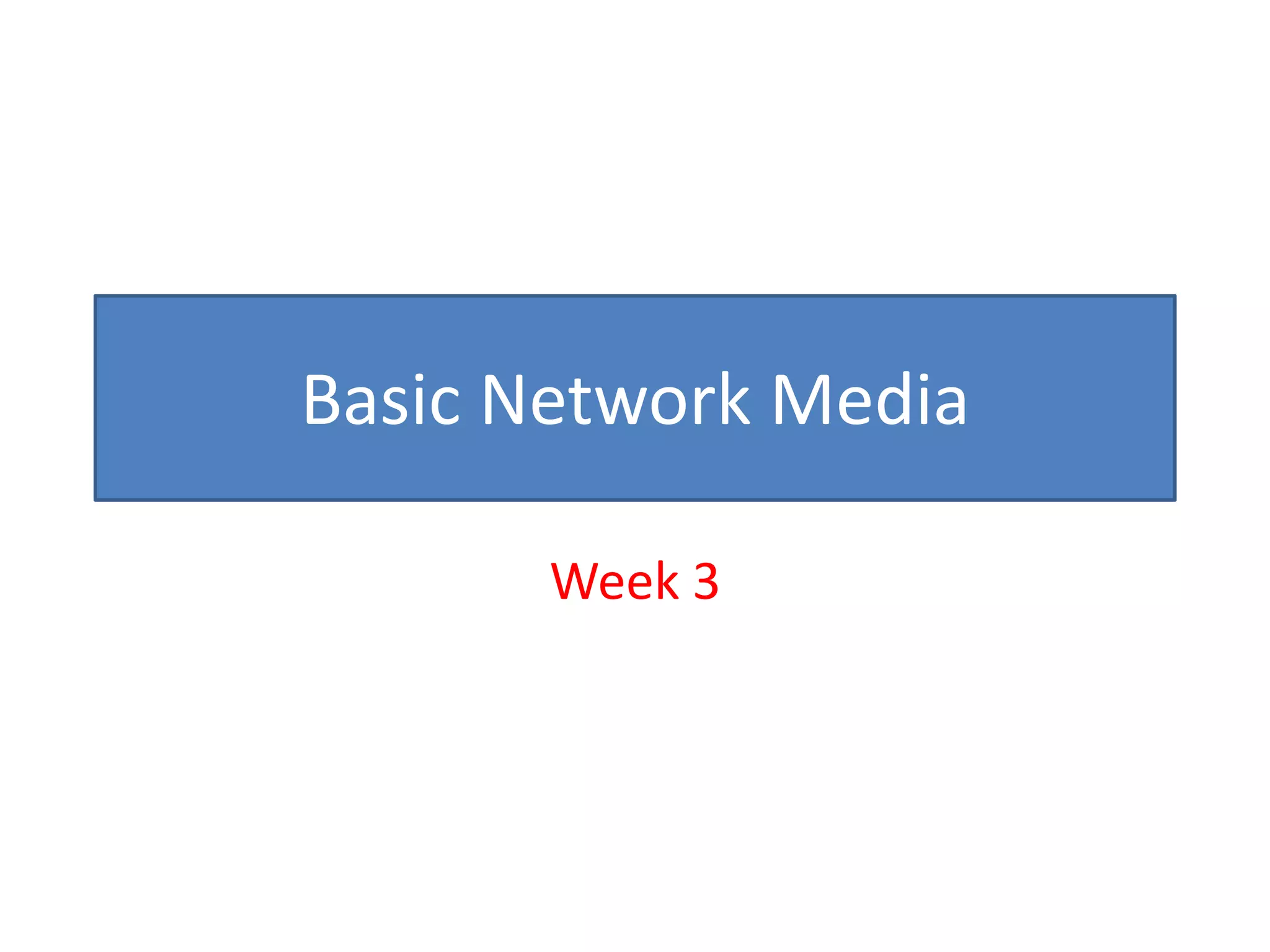 This document discusses basic network media and cabling types. It introduces common network terms and examines the physical aspects of connecting computers. The three primary cable types are coaxial, twisted-pair, and fiber-optic. Coaxial cable uses thinnet or thicknet variants and BNC connectors. Twisted-pair includes unshielded and shielded variants in categories that support different data speeds. Fiber-optic cable transmits data via light pulses and is immune to interference.
