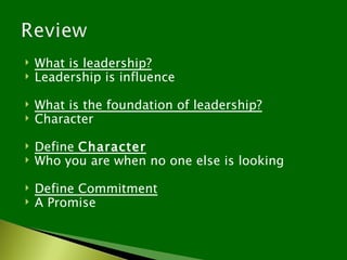 This document discusses the importance of discipline for leadership. It defines discipline as "doing the right thing, the right way, all the time." Discipline comes from within and is essential for achieving goals and becoming the person you want to be. The document provides tips for developing self-discipline, including organizing your life around priorities, managing your time effectively, and committing to small goals over 30 days to practice discipline. Developing mastery over oneself through discipline is seen as the foundation for being able to lead others.