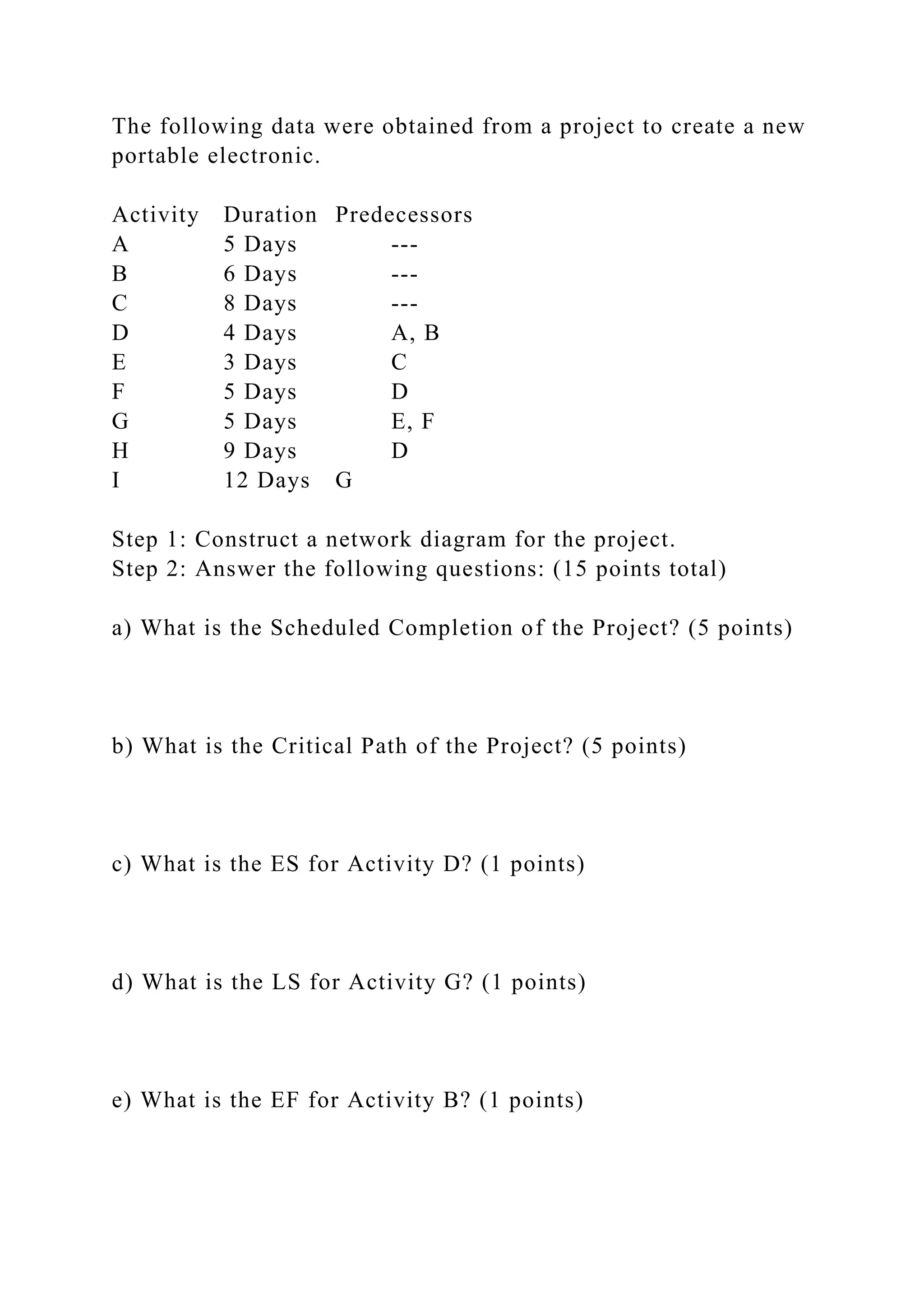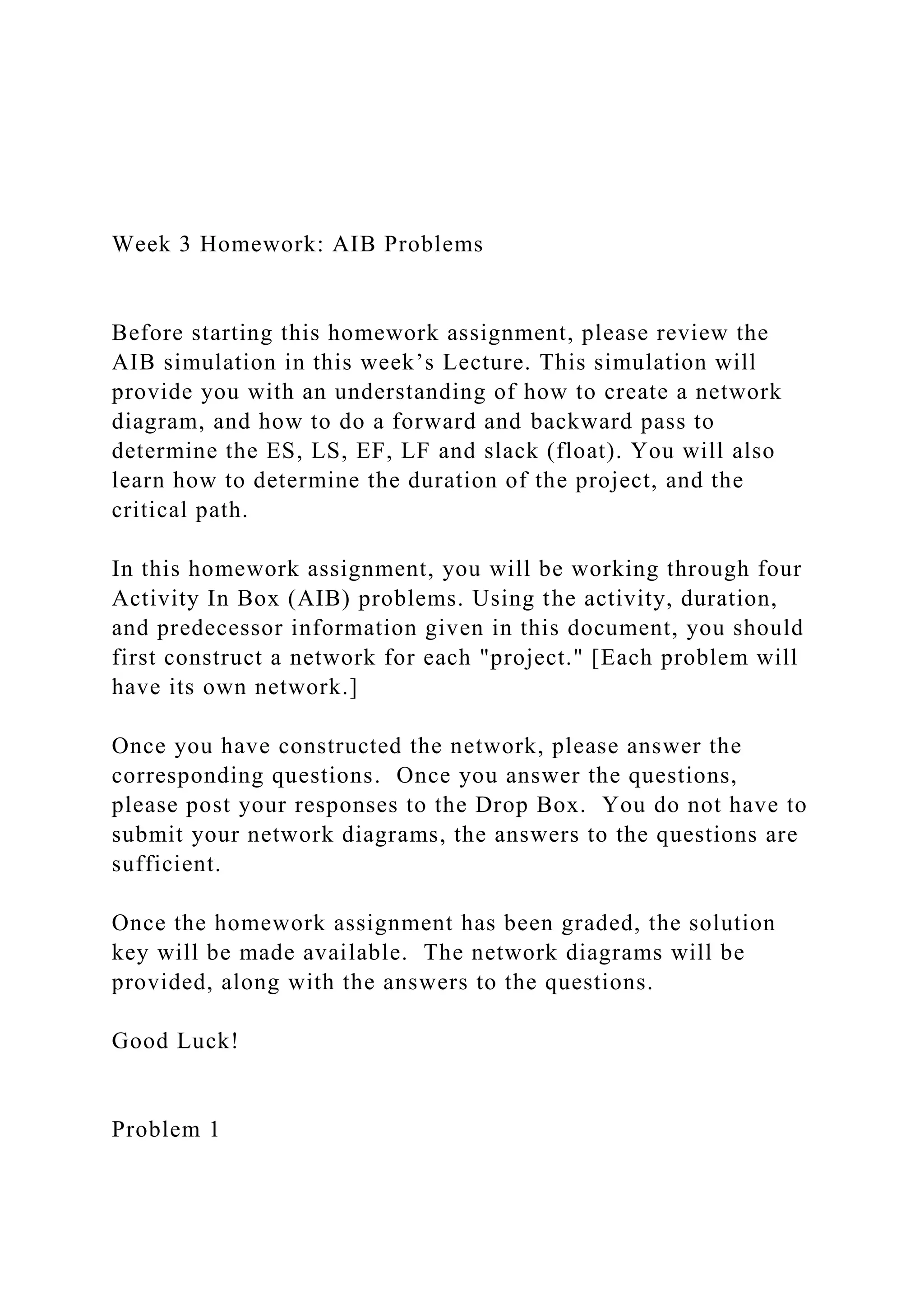 The document outlines a week 3 homework assignment focused on project management using the 'Activity In Box' (AIB) method, highlighting the construction of network diagrams and analyzing project activities' durations to calculate completion times and critical paths. It includes four distinct problems where students are required to create network diagrams from given activity data and answer related questions about scheduled completion and slack times. Students are instructed to submit their answers to a dropbox without the need to submit network diagrams.