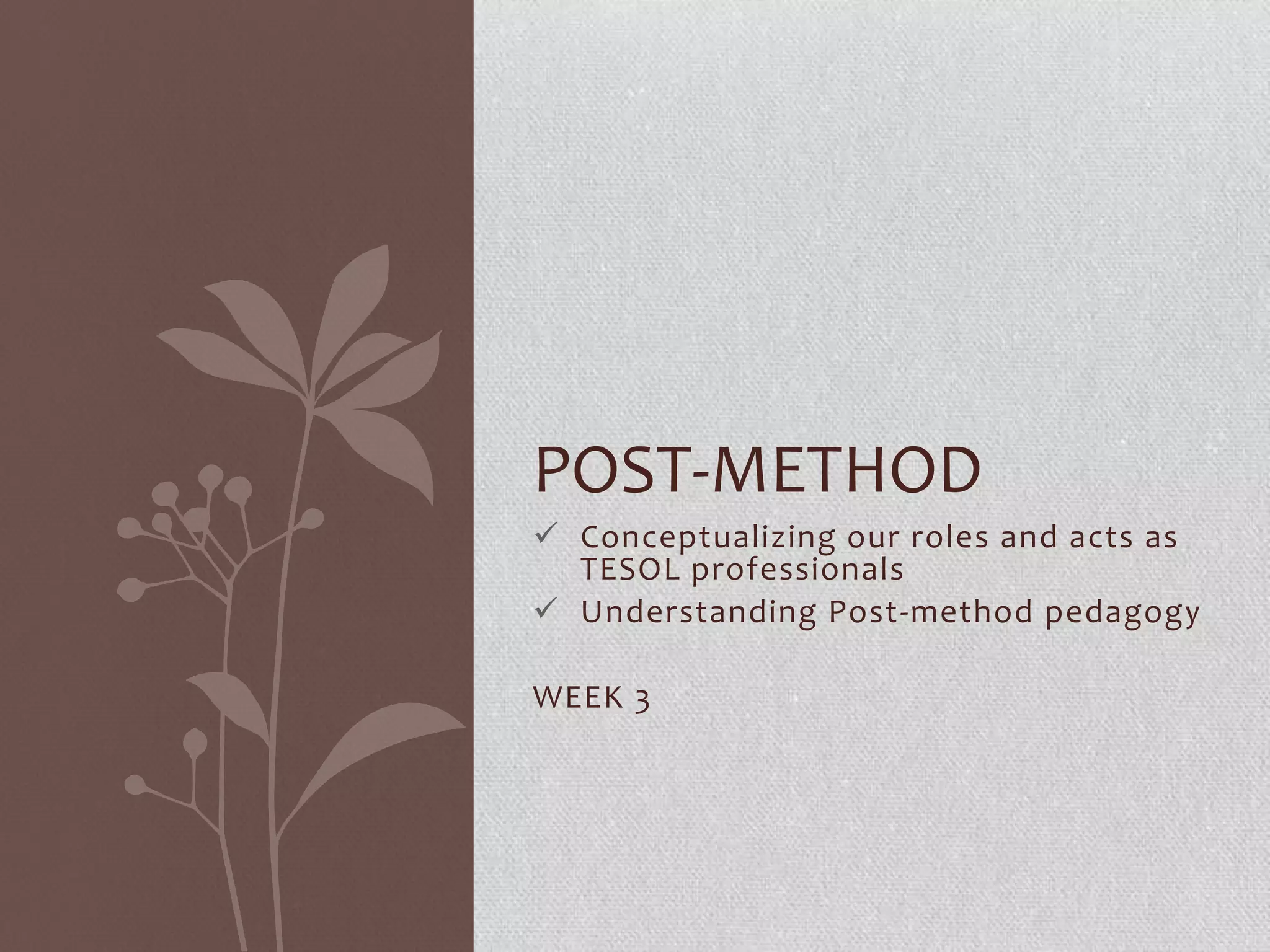 This document discusses post-method pedagogy in TESOL education. It covers three key topics: