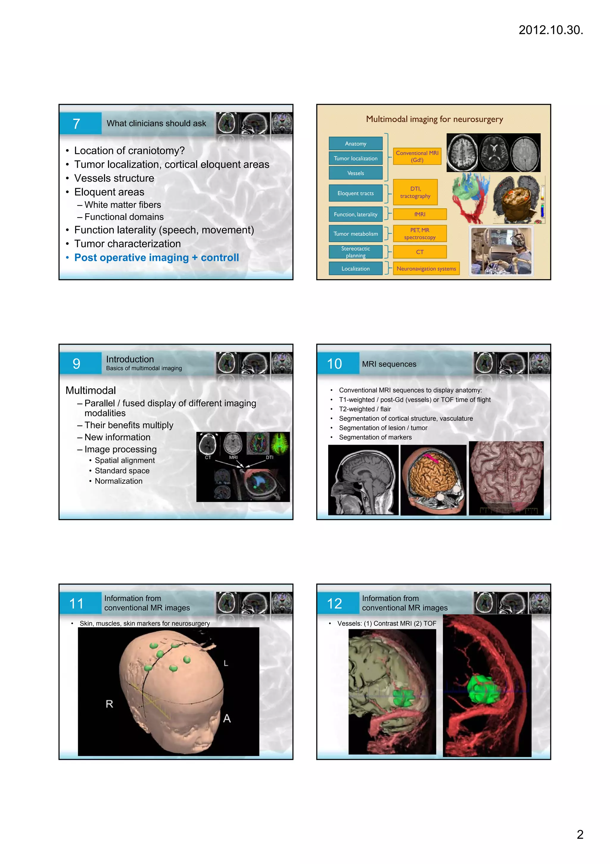 The document discusses the use of multimodal imaging in neurosurgery. It describes how multimodal imaging can provide maximum information beyond just anatomical structures, including blood supply, function, and spatial visualization to help with surgical planning and navigation. It outlines some of the key indications for neurosurgery like tumors, arteriovenous malformations, epilepsy, and discusses how clinicians can utilize different imaging modalities like MRI, DTI, fMRI, and PET to obtain information on anatomy, vessels, eloquent tracts, function and laterality, tumor characterization and metabolism, and localization for stereotactic planning.