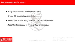This module covers advanced PowerPoint features like 3D models, morph transitions, and Prezi. It teaches how to insert 3D models from online sources or files, position and rotate models, and animate them using morph and animations. It also introduces the online presentation tool Prezi and provides an exercise to create a simple Prezi presentation by signing up and getting started. The next week will cover writing tools and techniques in Microsoft Word like formatting text styles, autogenerating tables of contents, and taking notes on literature.