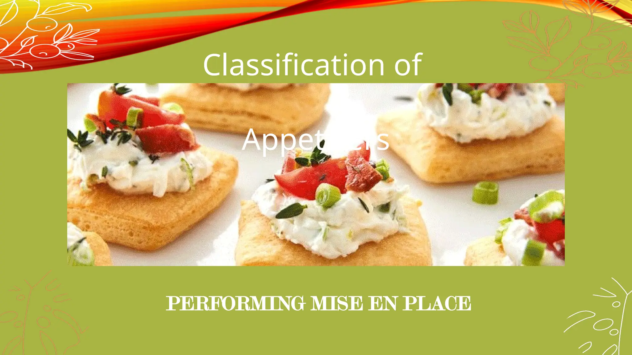 The document discusses appetizers, defining them as food or drink served before a meal to stimulate appetite, and outlines various types including canapés and dips. It explains the concept of 'mise en place' as a preparation technique essential for efficient cooking, and differentiates between hot and cold appetizers, their presentation methods, and service styles. Additionally, it includes tips for exam preparation and organizes groups for an assignment related to appetizers.