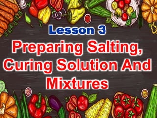 The document outlines essential practices and definitions related to salting and curing in food handling. It emphasizes sanitary food handling procedures, the roles of various curing ingredients like salt and sugar, and techniques for preparing curing mixes for meat products. Best practices for food handlers, including avoiding contamination and accurate measurement of ingredients, are also discussed.