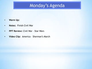 This document outlines the weekly agenda for a classroom from April 23-27. It includes warm up activities each day, completing notes on the Civil War, turning in a secession map assignment on Monday, reviewing for the STAAR tests with PowerPoint and videos, and taking the Science and Social Studies STAAR tests on Thursday and Friday respectively.