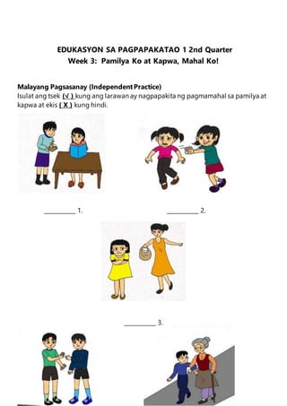 Ang dokumento ay naglalaman ng iba't ibang aktibidad para sa mga mag-aaral sa Grade 1 na nakatuon sa mga paksa tulad ng pamilya, pagmamahal sa kapwa, pagbibilang at pagdaragdag. Ito ay naglalaman ng mga independiyenteng pagsasanay at pagtatasa sa bawat aralin, pati na rin mga performance task na nangangailangan ng paglikha at pagsasagawa ng mga gawain sa bahay. Ang mga aktibidad ay idinisenyo upang mapalawak ang kaalaman at kasanayan ng mga mag-aaral sa iba't ibang asignatura.