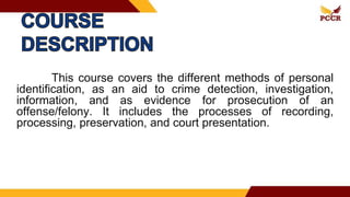Fingerprints are the most reliable method of personal identification. This course covers various identification methods used in criminal investigations and prosecutions. It discusses the classification of fingerprint patterns and the history of fingerprint identification from ancient China to its modern use. Key developments include Galton's establishment of fingerprint patterns, Henry's creation of fingerprint databases in India, and DNA testing which now provides the most accurate identification. A variety of physical characteristics can be used for identification, but fingerprints, photographs, blood samples, and DNA remain the scientific standards.