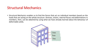 1. Structural mechanics enables determining forces on members based on loads on the whole structure. Stresses and deformations can then be obtained.