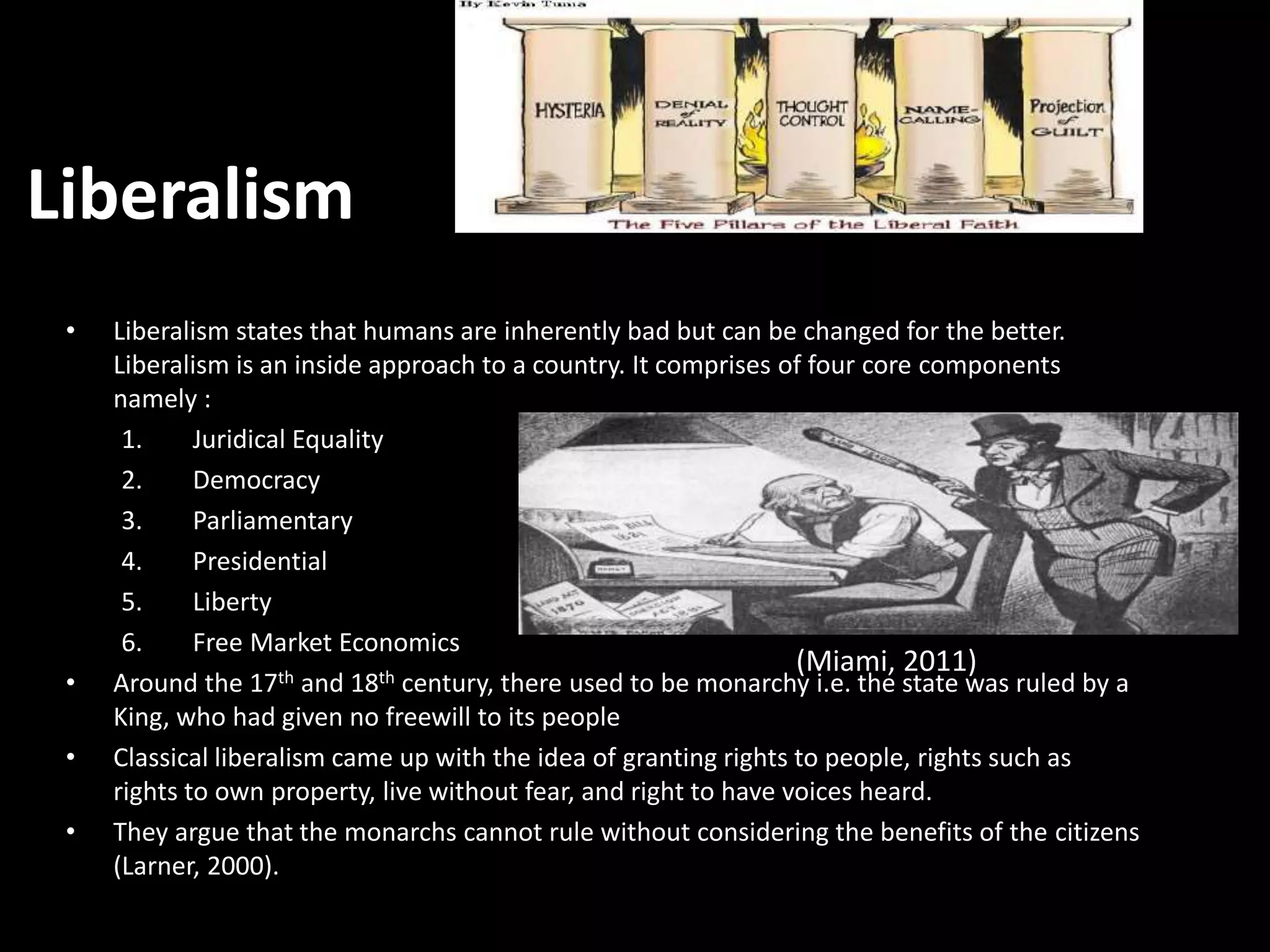 Neo-liberalism argues that free trade between nations promotes global prosperity and peace. It believes states should interact through institutions to resolve conflicts and reduce the likelihood of war. However, critics argue that neo-liberalism neglects social equality within nations and could lead governments to prioritize economic goals over citizens' basic needs. While neo-liberalism may prevent international conflict, it risks fueling domestic unrest if a country's people cannot afford basic necessities.