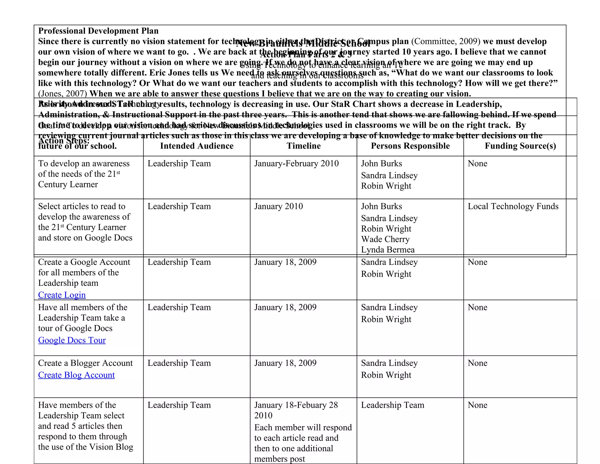 This document outlines a 3-phase professional development plan to develop a vision and increase the use of technology at New Braunfels Middle School. Phase 1 focuses on developing a technology vision through reading articles and blog discussions. Phase 2 improves teacher awareness of technologies through self-paced trainings and a staff development on technology integration. Phase 3 increases classroom technology integration through support from a district specialist, department meetings, and ongoing teacher support. Each phase includes action steps, timelines, responsibilities, and evaluation plans to measure outcomes like leadership team participation, training completion rates, and increased technology use in lesson plans.