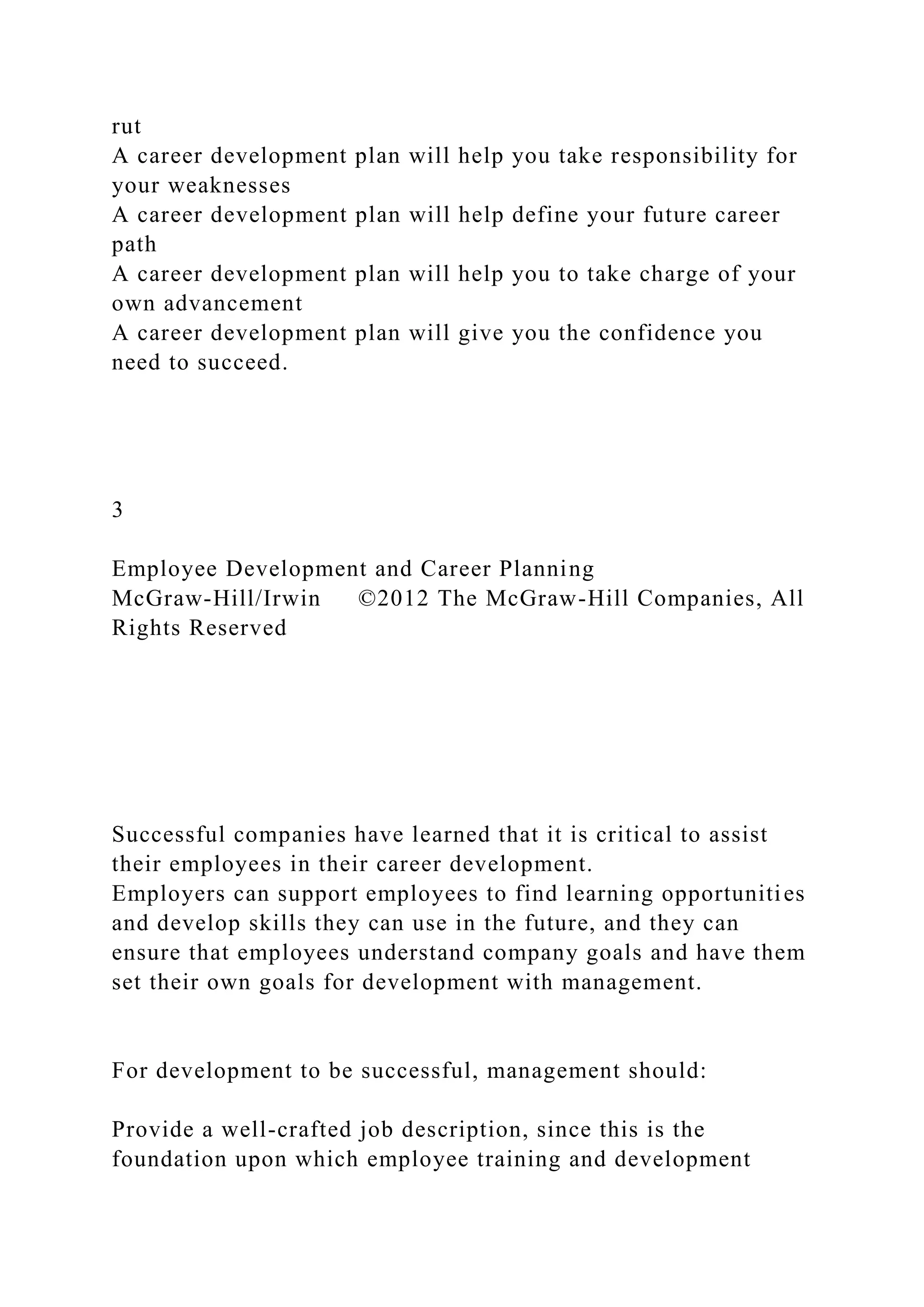 The document discusses the importance of career planning, emphasizing proactive steps individuals should take to develop their careers, including goal setting and networking. It outlines the role of employers in facilitating employee development and highlights the necessity of having a career development plan to avoid stagnation and achieve professional growth. Key elements include understanding personal strengths and weaknesses, setting realistic goals, and creating individual development plans to guide career trajectories.