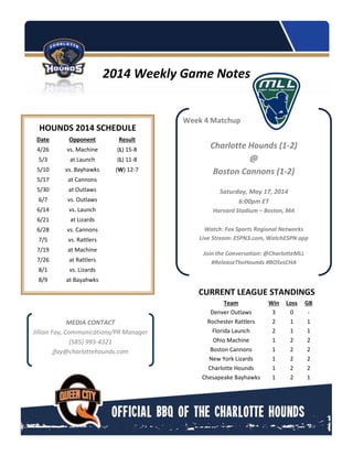 The Charlotte Hounds have a 1-2 record and will face the 1-2 Boston Cannons on May 17. The Hounds defeated the Bayhawks 12-7 last week for their first win. The Cannons have lost two straight games by one goal each. The teams have faced off four times before, with the Cannons winning each time by a combined margin of three goals. Players to watch include Tim Fallon and Mason Poli for the Hounds, and Kevin Buchanon and Brodie Merrill for the Cannons.