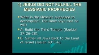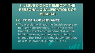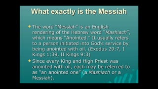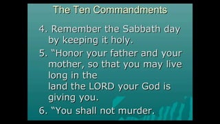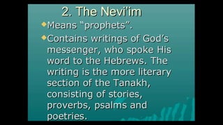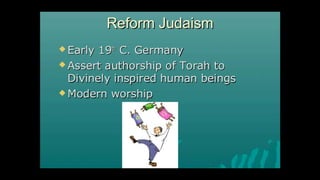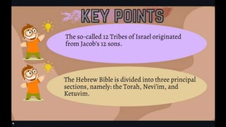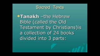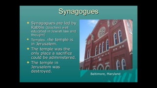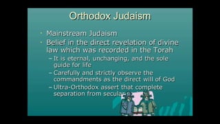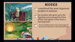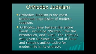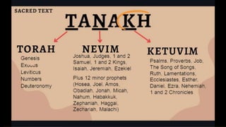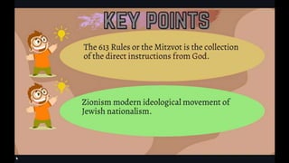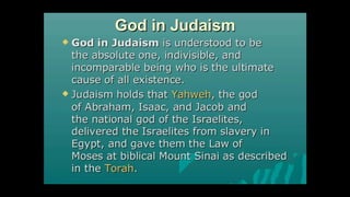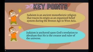 This document outlines learning objectives for understanding Judaism, including reciting the Ten Commandments from Exodus 20, justifying the Jewish belief in one God through their covenant with God as a chosen people, and identifying a story from the Old Testament like Samson that demonstrates this core belief in monotheism. The objectives are meant to help readers understand key aspects of Judaism by the end of a learning module.