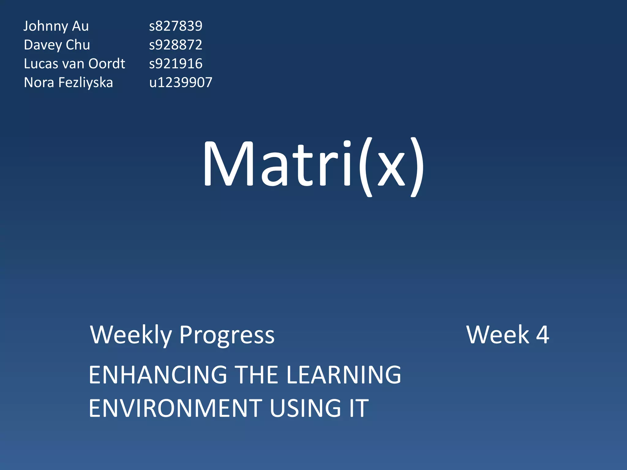 The document provides a weekly progress report for a group project called Matri(x) that is developing an application to enhance learning using IT. It discusses the tasks divided among the group members including literature research, application development, documentation, and report writing. It summarizes key findings from the literature on timing instruction, meeting deadlines, and addressing disagreements between students. Screenshots are included and the group plans to finalize the application and literature research, continue writing the report, conduct questionnaires, and begin the final video.