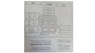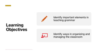The document discusses teaching grammar, including identifying important elements and organizing the classroom. It describes the stages of a sample grammar lesson as present, practice, and produce. Key questions about teaching grammar and how learners need exposure, notice forms, understand meaning and use, practice, and remember items are discussed. Guided discovery techniques teachers can use like asking questions about meaning, context and form are outlined. The importance of allowing practice, speaking, and writing is emphasized.