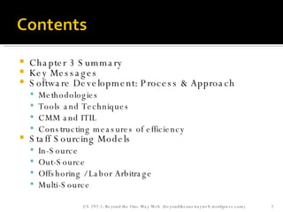 The document discusses software development methodologies, processes, and approaches. It covers topics like procedural vs object oriented programming, agile vs waterfall methodologies, tools and techniques like CASE and IDEs, and measures of efficiency like CMM and ITIL. It also discusses sourcing models like in-sourcing, outsourcing, and offshoring labor for cost savings.
