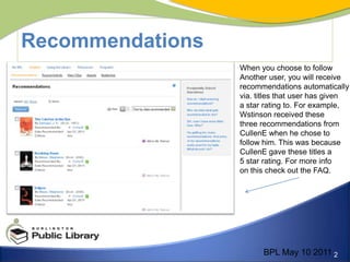 The document provides training information for staff on the Explore Tab of the BPL Catalogue. It describes how users will receive recommendations for titles when they follow another user based on ratings that user gave titles. It also outlines how the Recent Activity, New Titles, Awards/Bestsellers, and Help sections work on the Explore Tab.
