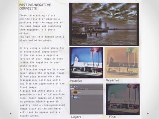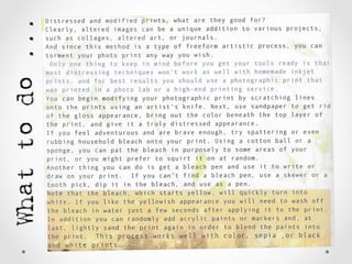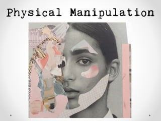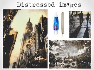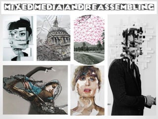 This document provides instructions for mixed media and reassembling techniques using collage, printing, image transfer, stitching, and cutting up images to create self-expression. It suggests printing an image on paper and acetate and layering them, transferring an image onto a collage background, collaging on a print and adding details, stitching into an image to emphasize key details, and cutting up and reassembling an image with collage. It also prompts the reader to find an image manipulation artist for inspiration and use at least three physical manipulation processes, linking their experiments to artists in their sketchbook.