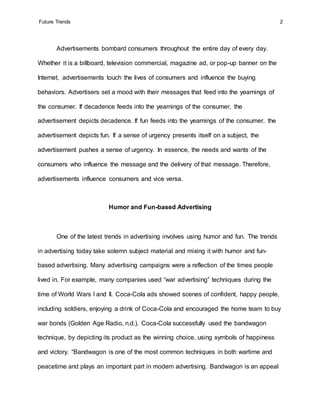 This document discusses future trends in advertising. It predicts that in 10 years, advertisements will need to be more attention-getting, interactive, and brief due to consumers having less time and shorter attention spans. Small businesses will be able to market themselves globally through online tools. However, some consumers may want fewer product ads, so personalized advertising based on personal data and interests may become more common, though this raises privacy concerns. Celebrity endorsements and visually appealing images in ads will also remain effective strategies.