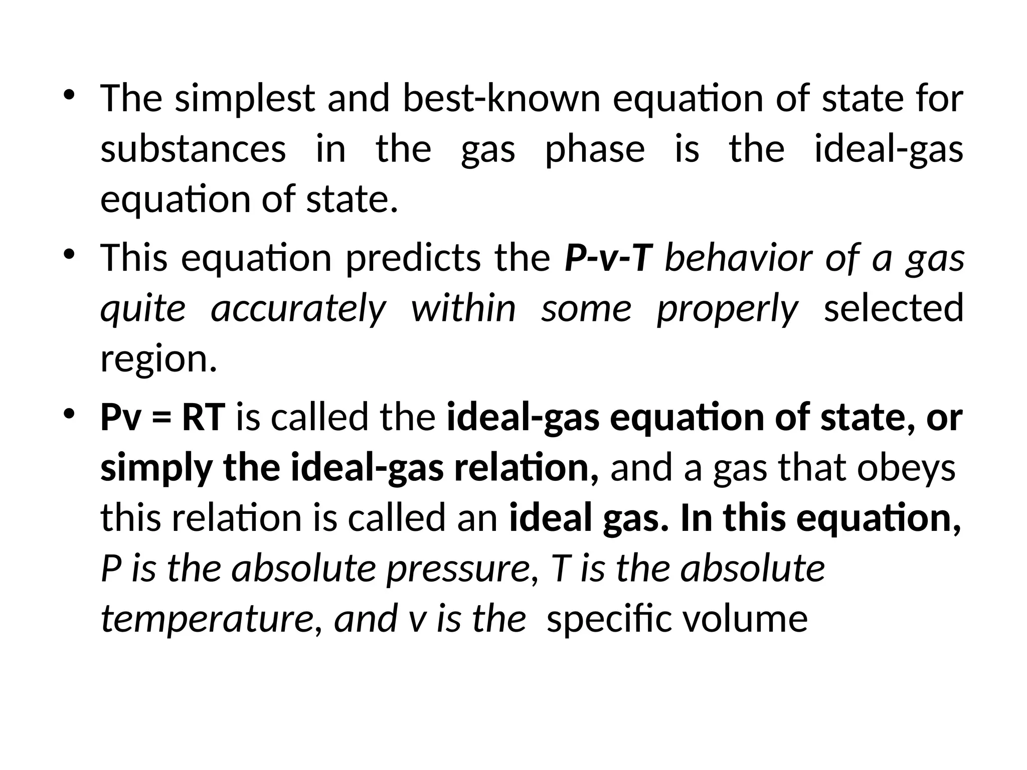 The document discusses the properties of ideal gases and their equation of state, particularly the ideal-gas equation pv = rt, which accurately predicts gas behavior under certain conditions. It introduces the compressibility factor z to account for deviations from ideal behavior, especially near critical points or saturation regions. Various equations for process calculations are also presented, focusing on thermodynamic processes involving ideal gases.