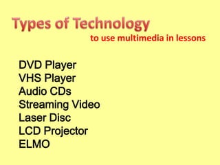 Multimedia can enhance student learning in several ways. It can broaden students' knowledge by providing visual context that makes lessons more engaging and understandable. Research also shows multimedia can help expand students' vocabularies. Videos, images, and audio can be used as pre-activities, extended activities, and to spark class discussions, helping students make connections between multimedia content and classroom lessons. Teachers also benefit from being able to save and access multimedia materials digitally rather than relying on physical materials like chalkboards.