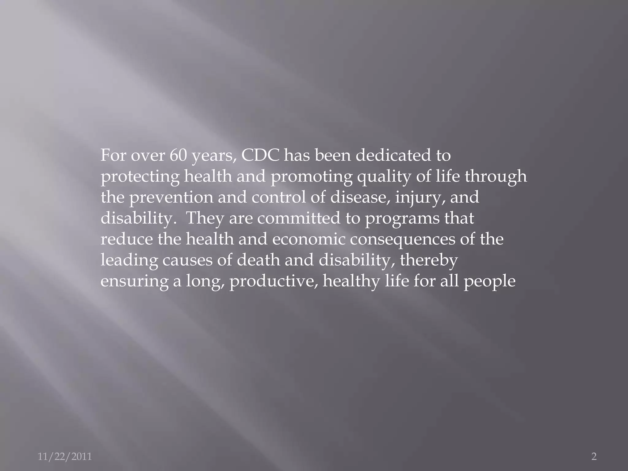 The CDC is dedicated to protecting health and promoting quality of life through preventing and controlling disease, injury, and disability. It conducts research and investigations and applies findings to improve people's health and respond to emergencies. The CDC website provides information on various health topics from diseases to emergency preparedness to environmental health. It offers in-depth resources on conditions like Hantavirus, including statistics, publications, education materials, and technical information to support research and prevention.